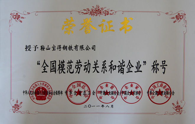 2011年8月15日,在北京召開的全國構(gòu)建和諧勞動關(guān)系先進(jìn)表彰暨經(jīng)驗交流會上,公司被國家人力資源和社會保障部、中華全國總工會、中國企業(yè)聯(lián)合會、中國企業(yè)家協(xié)會、中華全國工商業(yè)聯(lián)合會表彰,并授予“全國模范勞動關(guān)系和諧企業(yè)”稱號。鞍山市僅寶得公司一家企業(yè)獲此殊榮。