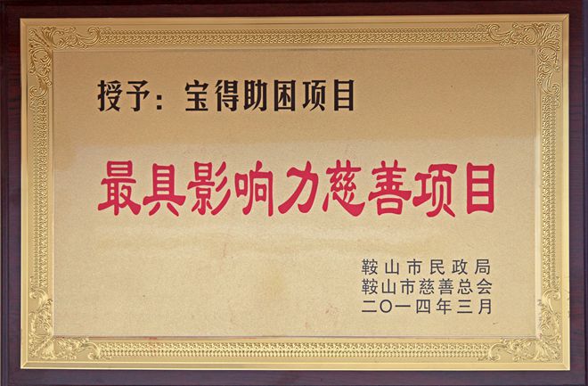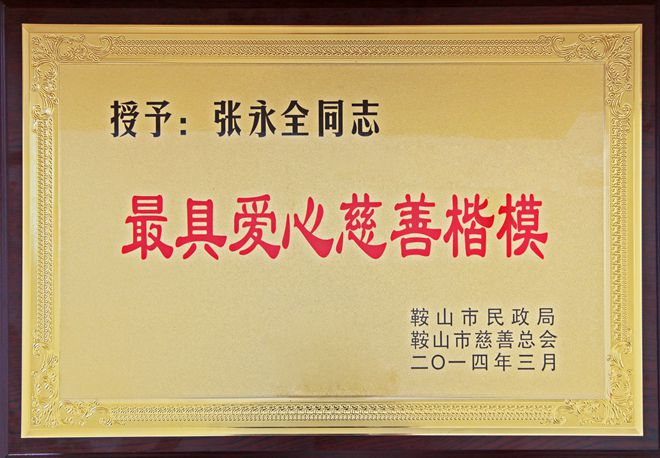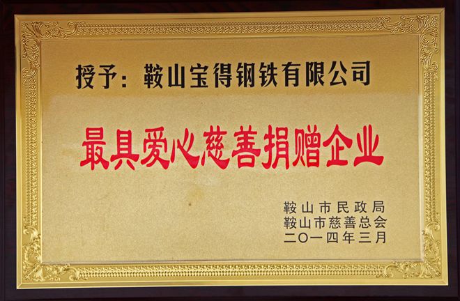 3月7日,在鞍山市慈善總會第三次會員大會上,公司榮獲“最具愛心慈善捐贈企業(yè)”、“最具影響力慈善項目”榮譽(yù),董事長榮獲“最具愛愛心慈善楷模”榮譽(yù)稱號。