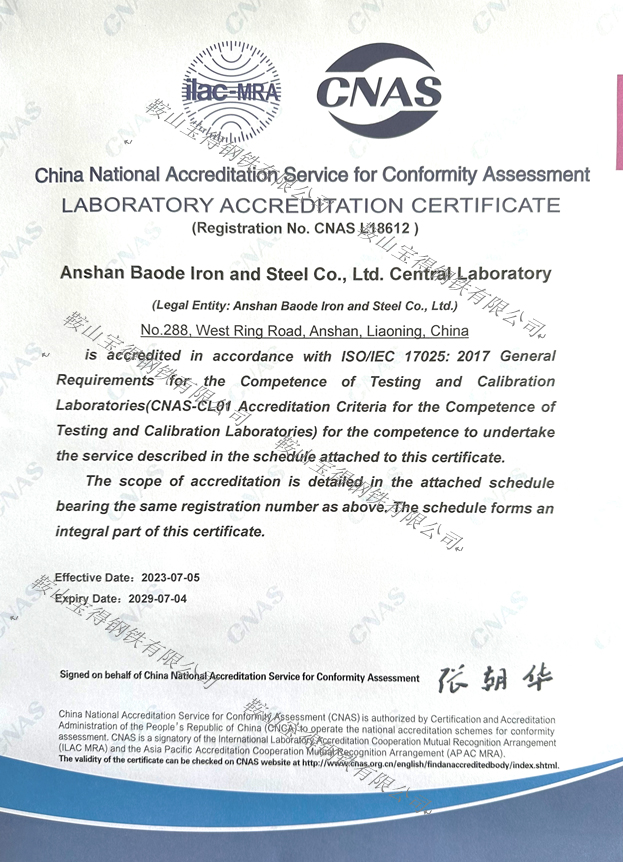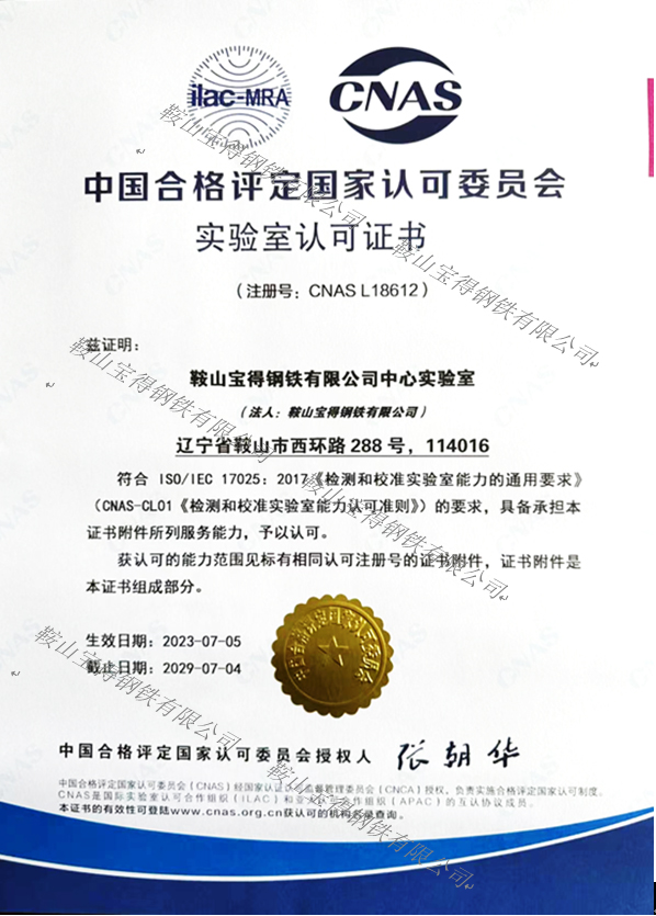 喜訊!鞍山寶得鋼鐵有限公司中心實驗室獲得 CNAS實驗室認(rèn)可證書